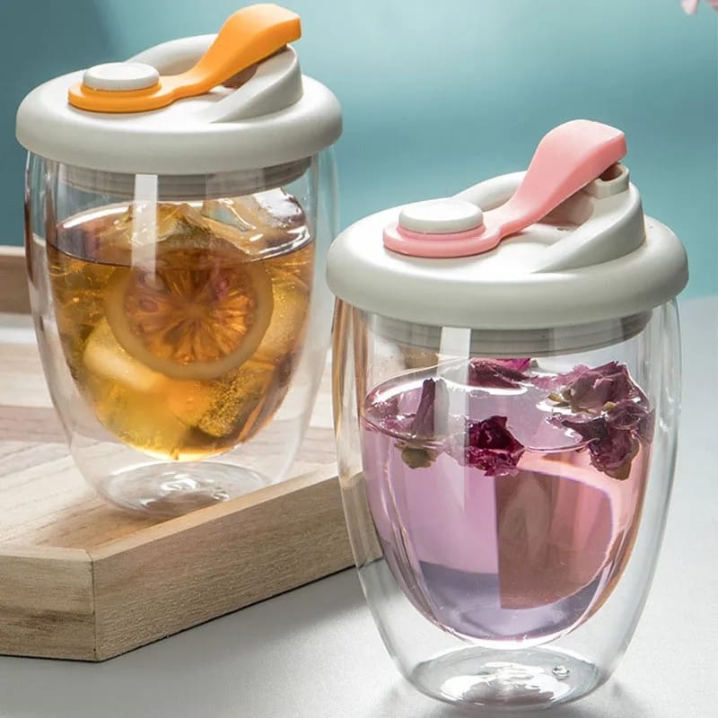 Double Wall Glass Mug With Lid Comfortable to hold, the elegant arc-shaped line keeps you...