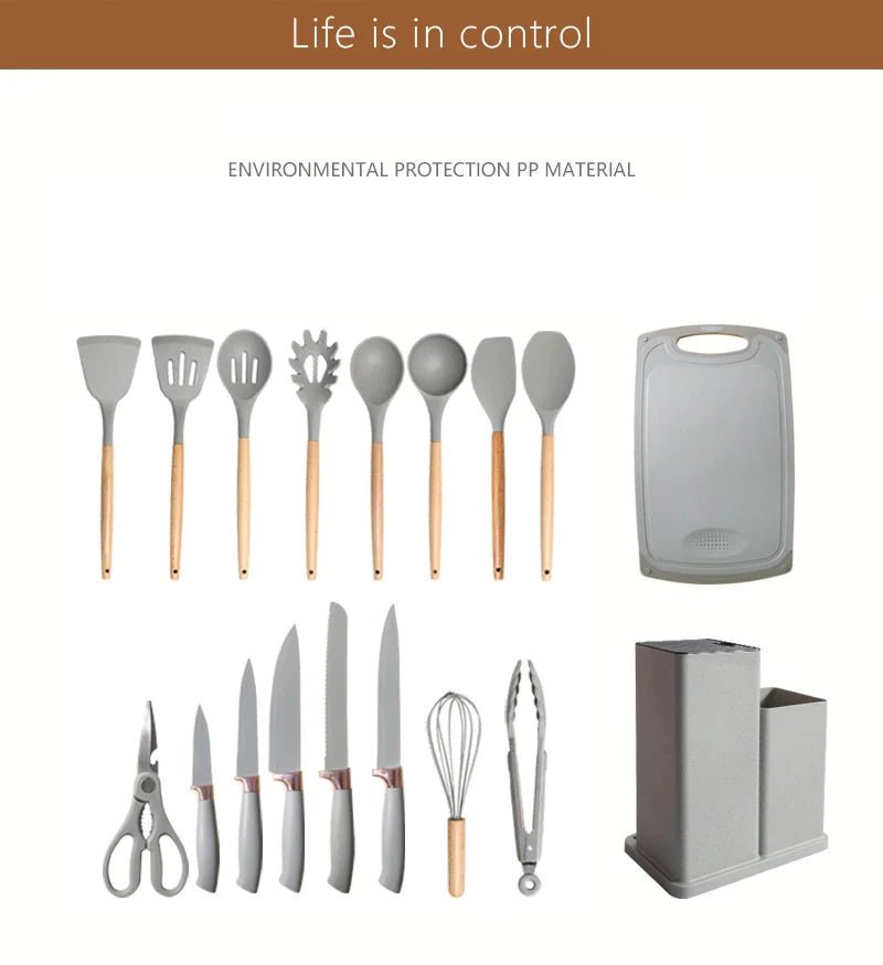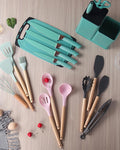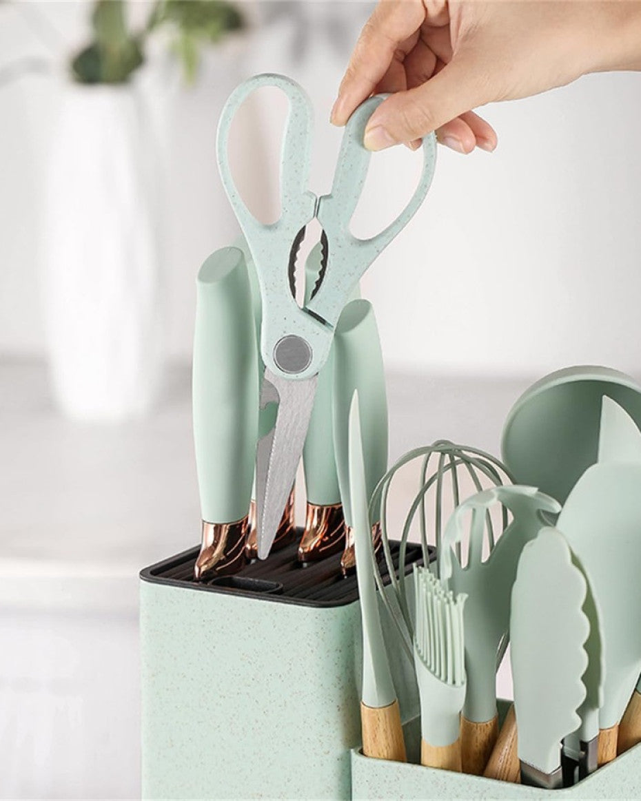 - Complete 19-Piece Set: Includes 9 silicone cooking utensils, 5 stainless steel knives, scissors, whisk, tongs, cutting board, and a dual-compartment storage block.