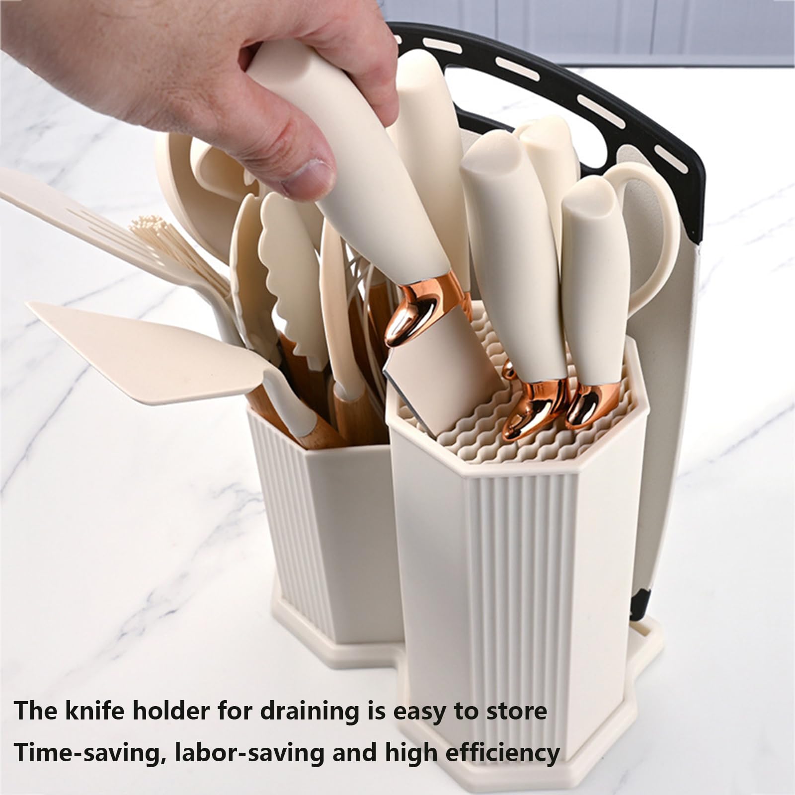 Comes with a knife holder with drainage, making it easy to organize, save space, and keep tools dry.