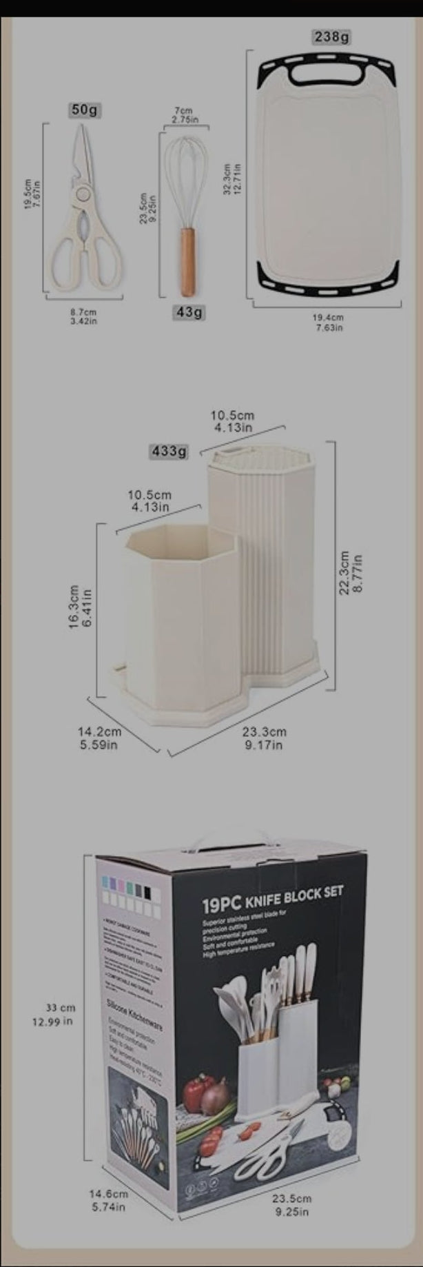 Knife Holder: 22.3 cm (H) × 14.2 cm (W) × 23.3 cm (L), 433g