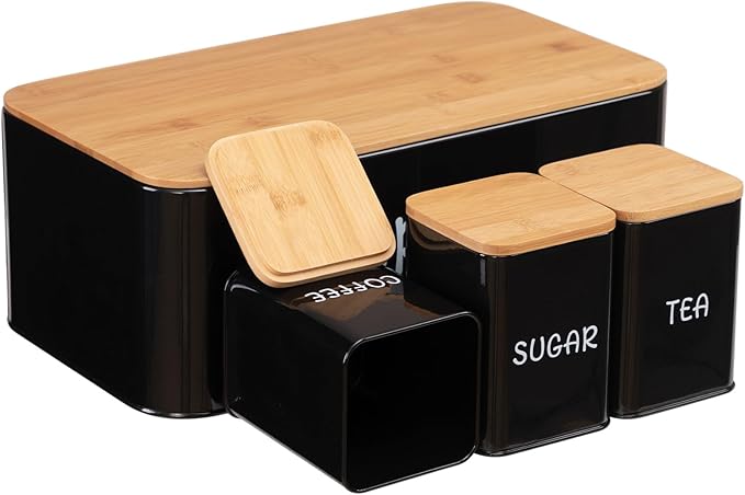 - Complete 4-Piece Set: Includes 1 large bread box and 3 labeled canisters for Tea, Coffee & Sugar.