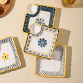 Bohemian-inspired floral patterns with a vibrant yellow rim and deep indigo accents add charm and personality to your table setting.
