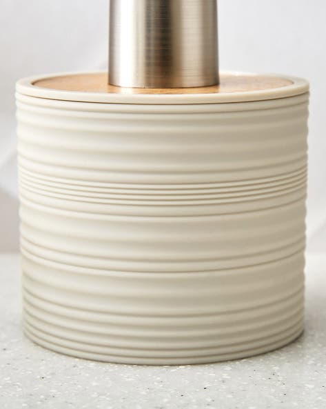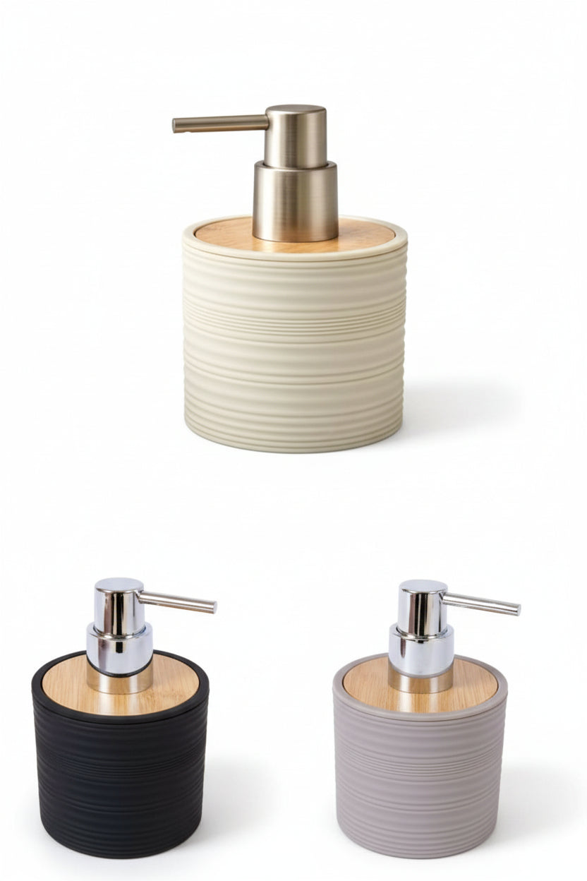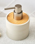 A modern, stylish cylindrical soap dispenser with a textured ribbed body and elegant bamboo-look base. Perfect for bathrooms, kitchens, or vanities. Available in Cream/Beige, Black, and Grey.