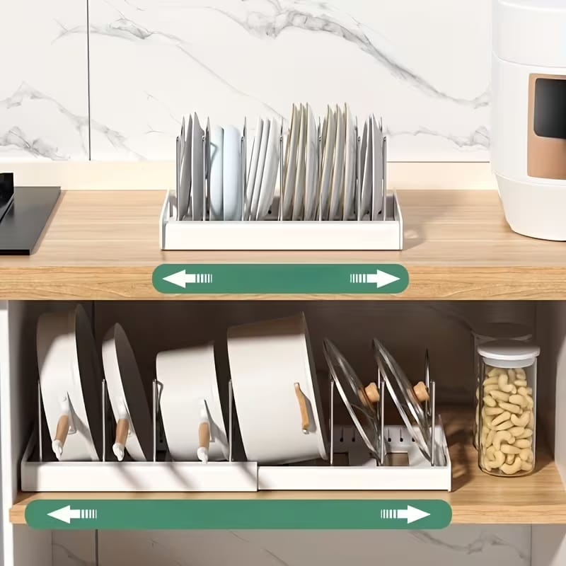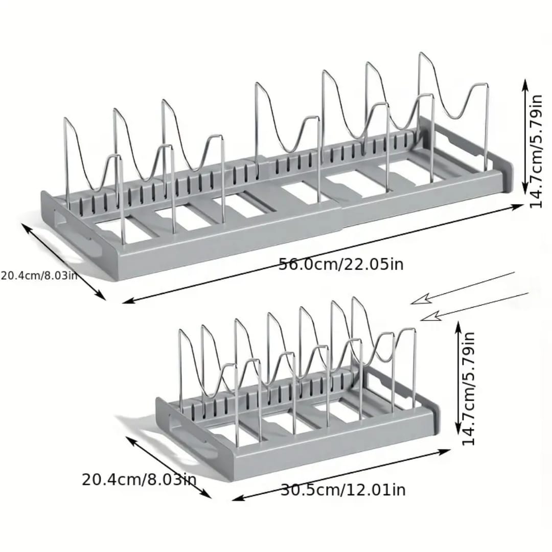 Expandable Pot & Pan Organizer with Adjustable U-Shaped Dividers – Vertical Cookware Storage for Lids, Pans, and Trays