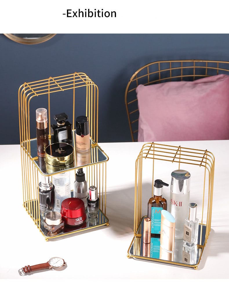 New Style Birdcage Makeup Organizer Metal Brass Cosmetic Organizer with Mirror Shelves square shape