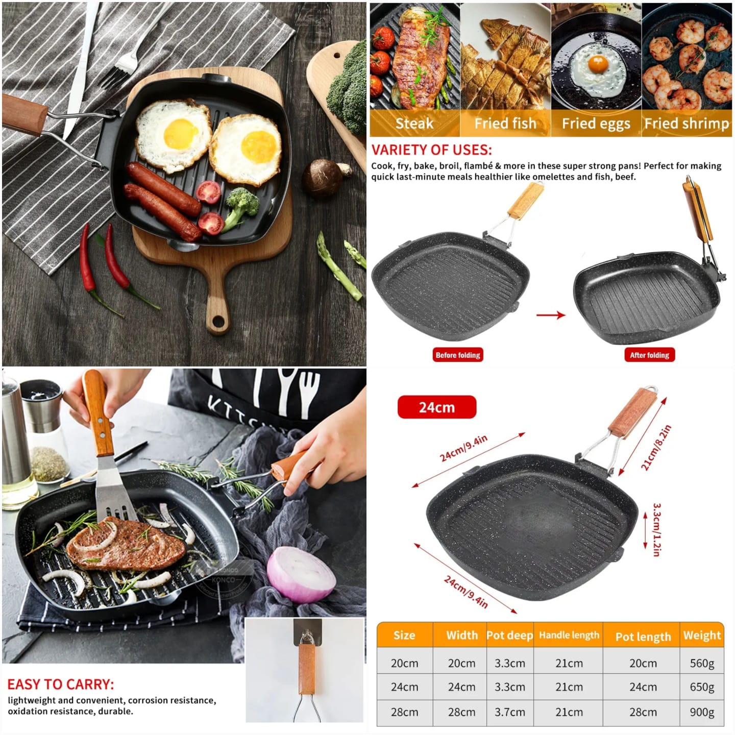 Nonstick Grill Pan with Folding Handle Striped Steak Frying Pan Square