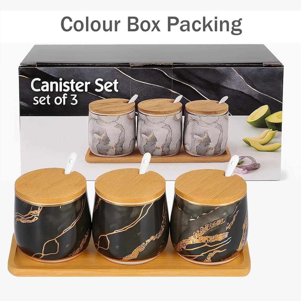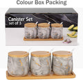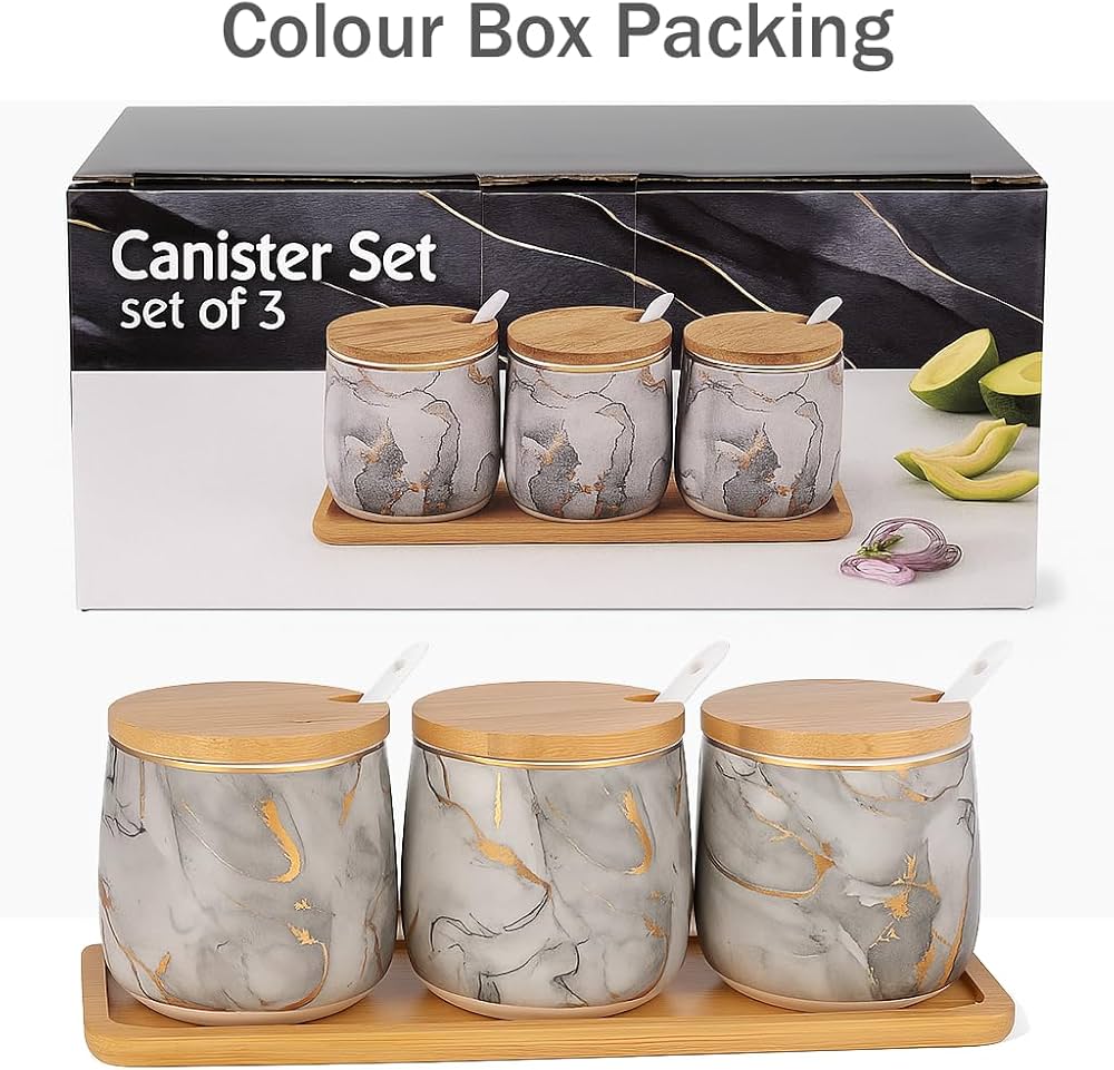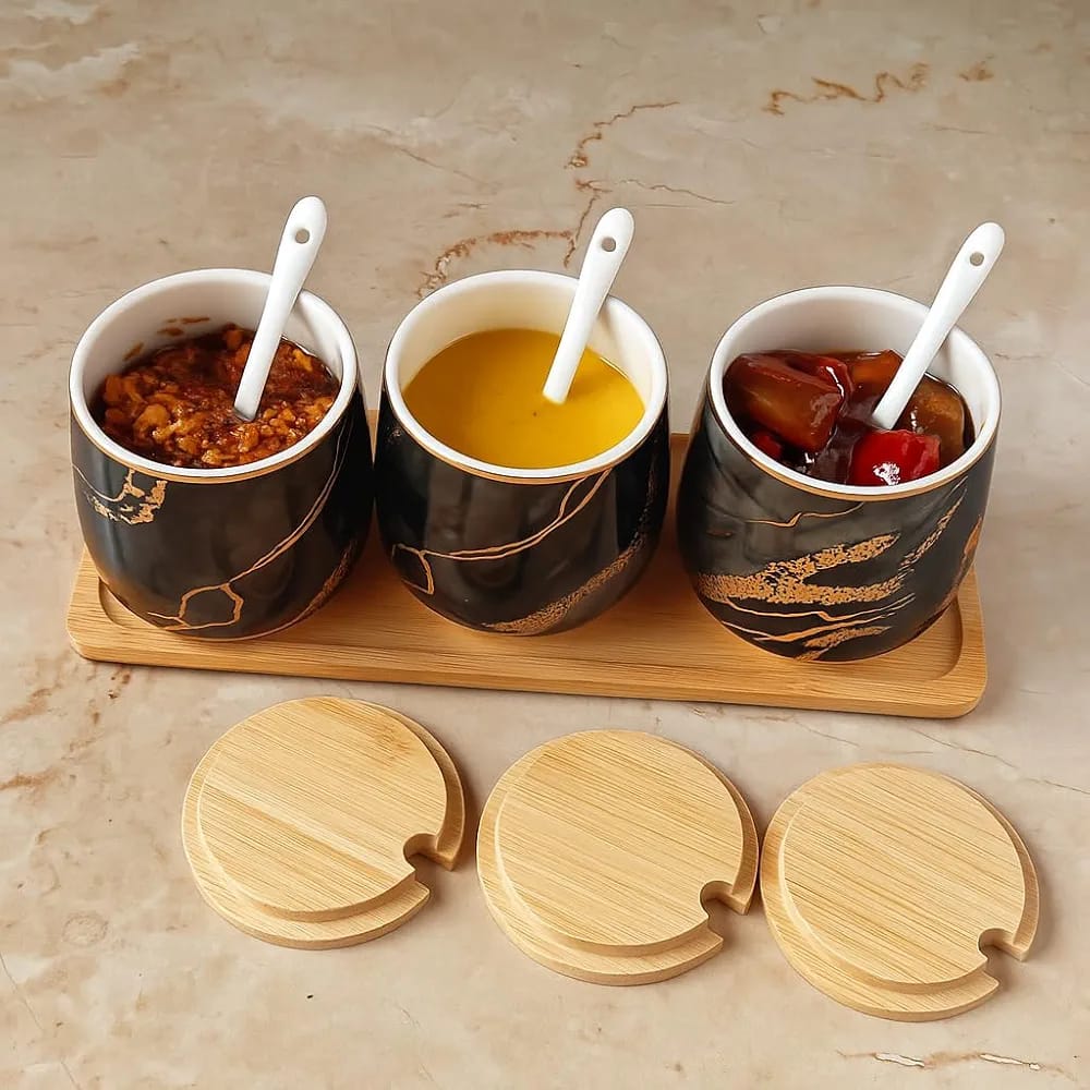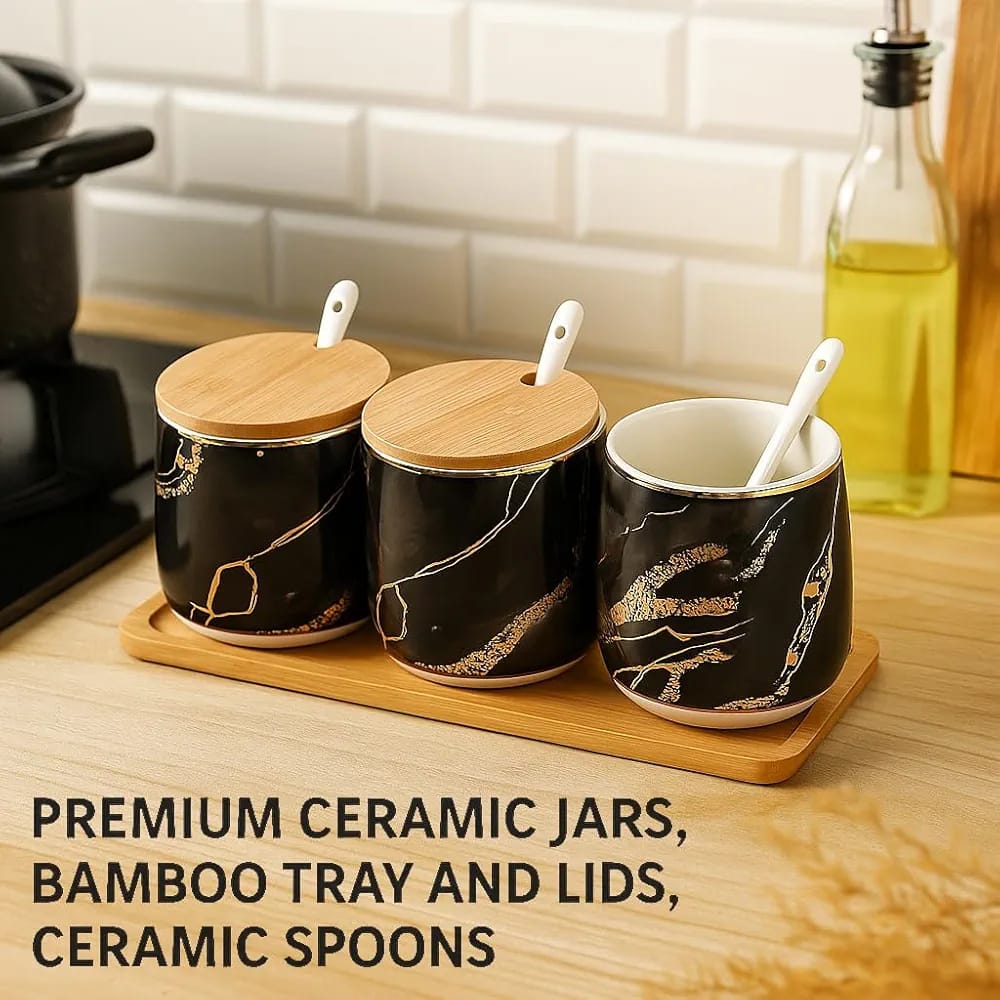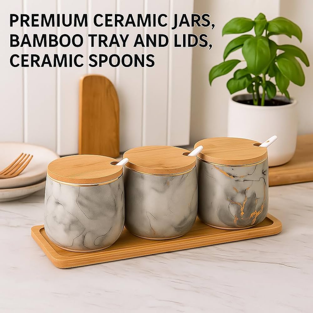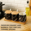 - Set Includes: 3 Ceramic Jars, 3 Bamboo Lids, 3 Ceramic Spoons, 1 Bamboo Tray
