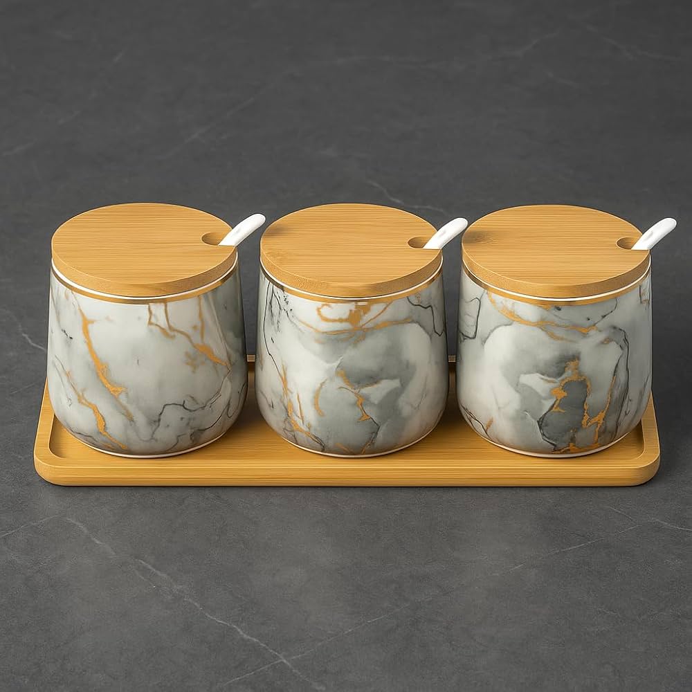 - Material: Premium Ceramic (jars & spoons), Natural Bamboo (lids & tray)