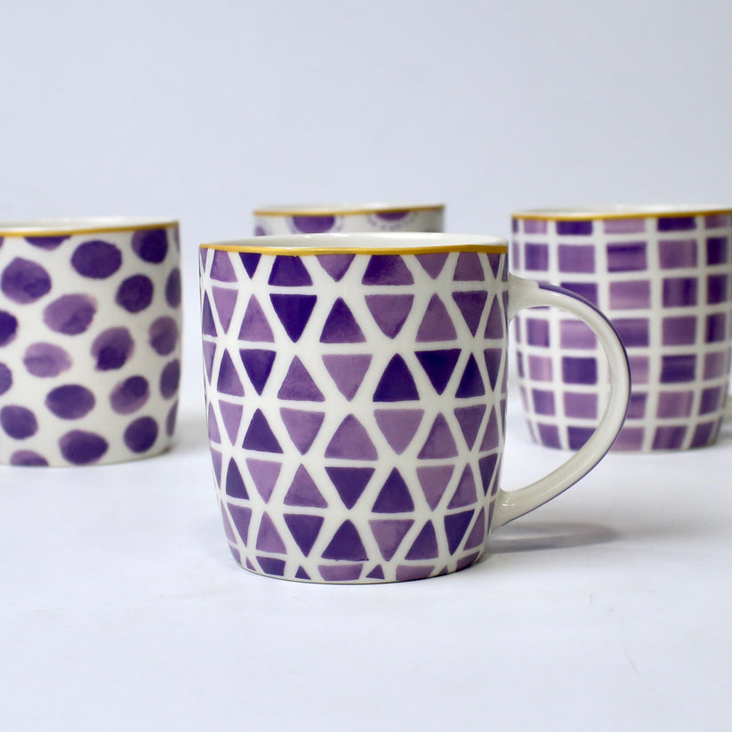 Brighten your coffee or tea moments with our Purple Pattern Ceramic Mug Collection, where everyday utility meets artistic flair. Each mug showcases a unique purple design — from abstract dots and modern grids to geometric triangles — all accented with a refined golden rim.