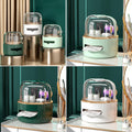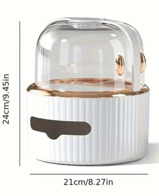 Combines a lower tissue/wet wipes dispenser with an upper clear dome organizer for storing cosmetics, cotton pads, perfume bottles, and other daily essentials.