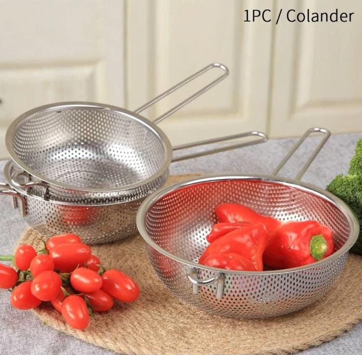 STAINLESS STEEL HIGH QUALITY MESH COLANDER FRUIT AND VEGETABLE BASKET WITH LONG HANDLE