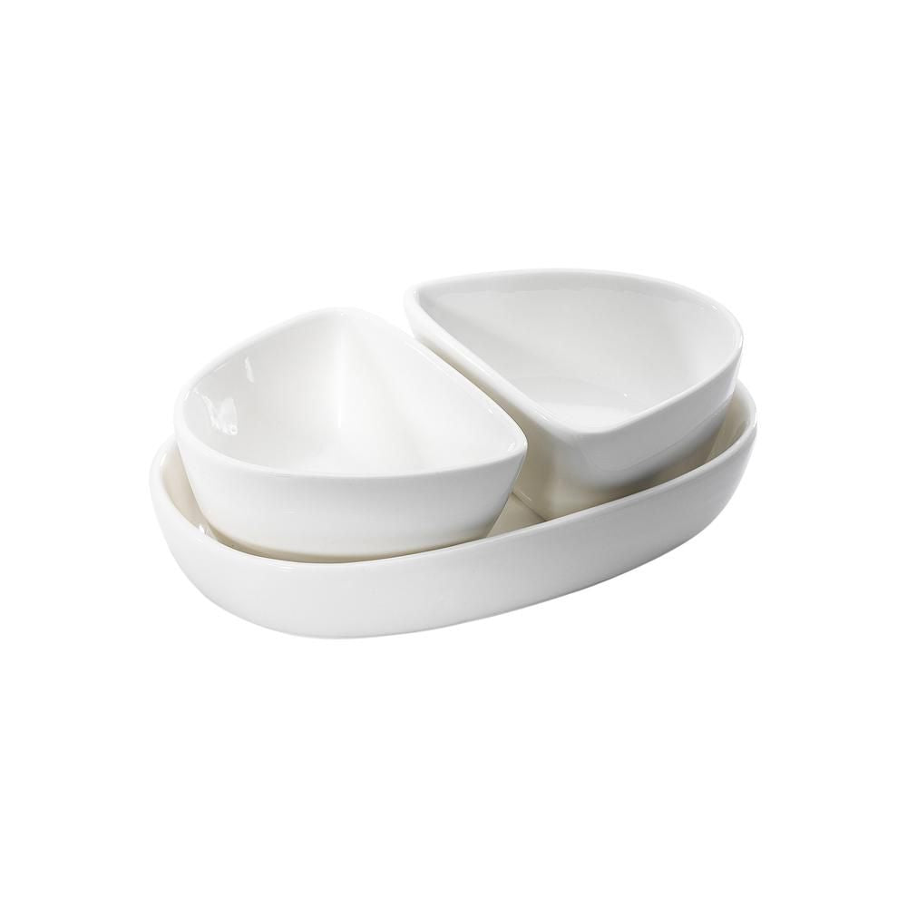 This stylish 3-piece serving set includes two uniquely shaped bowls that rest neatly inside a matching oval base tray. Ideal for serving condiments, dips, oils, salts, or small appetizers with a refined and organized look.