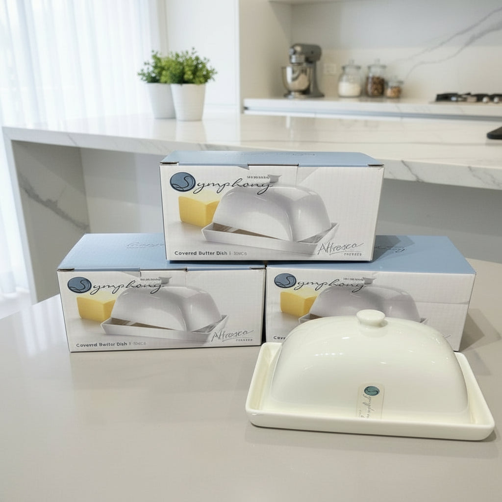 Bring timeless elegance to your kitchen with the Symphony Covered Butter Dish (ES-3830). Crafted from high-quality ceramic/porcelain, this 2-piece set keeps butter fresh, soft, and protected from odors or contaminants.
